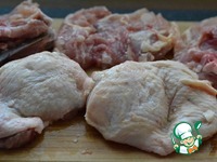 Удалить кость из куриного бедра. Нарезать бедро на 3 части, оставив кожу. Посолить и поперчить. |