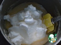 Желтки взбить с сахаром и ванильным сахаром. Добавить воду, подсолнечное масло, муку с разрыхлителем. Еще раз взбить. |