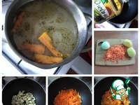 Время приготовления супа дала без готовки бульона. Если вы сварите бульон заранее, то сократите время приготовления супа. Мясо для супа берите любое: курицу; индейку; говядину; свинину;... на ваш вкус. Я сегодня сварю бульон из куриных крыльев. Выложила крылья в кастрюлю, залила водой, довела до кипения и слила первый бульон. Залила снова, довела до кипения, накипи в бульоне уже нет. Выложила целую луковицу в шелухе, от неё бульон будет золотистым. Поварила минут 30. Положила морковь крупно порезанную. Ещё варила до готовности моркови, лук выловила шумовкой. Положила в бульон 3 дольки очищенного чеснока, чабрец (тимьян), душистый перец и лавровый лист. Поварила ещё 3-5 минут. Бульон готов. Из бульона убираем мясо, морковь и чеснок. Процеживаем его. На нём будем и варить суп. В сотейнике греем масло, выкладываем лук мелко порезанный, золотим и добавляем натёртую морковь. Обжариваем или томим немного. |