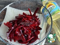 Нарезать свёклу тонкими брусочками, сбрызнуть растительным маслом. |