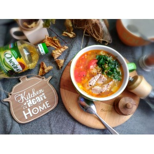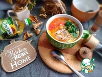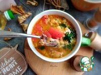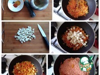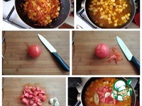 Чтобы сократить время приготовления супа, бульон из куриных крылышек я сварила заранее. Залила крылья водой, довела до кипения и слила первый бульон. Налила свежей воды, во втором бульоне накипи от куриного мяса уже не было. Выложила луковицу в шелухе, крупно порезанную морковь и корень петрушки. Варила примерно около часу. Начинаем варить суп. Готовим все овощи. Вместо картофеля я буду использовать репу. Если у вас репы нет, то положите картофель. Лук мелко режем, так же рубим мелко 2 зубчика чеснока, а три оставляем целыми. Мы его положим в конце приготовления супа. Морковь делим пополам. Одну часть натираем на тёрке, вторую часть нарезаем мелким кубиком. Это по желанию. Морковь можно всю натереть. Перец болгарский нарезаем тонкой соломкой. Я для приготовления возьму высокий сотейник, где сначала буду томить овощи, а далее варить суп. Используйте любую вами удобную посуду. Греем масло и выкладываем лук, золотим его. Добавляем морковь, убавляем огонь и накрываем крышкой, томим минут 5. Выкладываем перец болгарский и порубленный чеснок. Томим ещё пару минут под крышкой. |