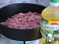 Добавить в сковороду с курицей нарезанный крупными перьями репчатый лук, перемешать. Готовить курицу с луком, периодически помешивая, минут 5-6. |