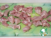 Филе бедрышек нарезать на небольшие кусочки (жир по возможности срезать). |