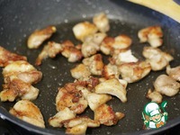 Затем разогреть сковороду и выложить в нее кусочки курицы. |