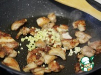 Добавить в сковороду нарезанные чеснок и имбирь, обжаривать все вместе секунд 30. Пахнуть будет сумасшедше вкусно! |
