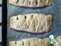Разделить тесто на кусочки (у меня получилось 12 шт.). Раскатать кусочек в прямоугольник (примерно 14 х 20). В центре выложить начинку, сделать надрезы. |