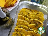 Включить духовку до 170 С. Уложить тыкву в форму и обмазать получившейся массой. |