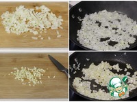 Мелко нарезать лук, обжарить его до легкой золотистости. Чеснок также мелко нарезать, добавить к луку, обжаривать все вместе секунд 30. |