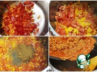 Морковь нарезать на мелкие кубики, сладкий перец и помидор нарезать чуть крупнее. Помидор можно предварительно очистить от кожицы. Отмерить необходимое количество сладкой паприки и тмина. |