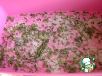 Насыпать часть смеси на дно коробки. Я ещё насыпала стебельки укропа. |