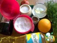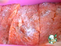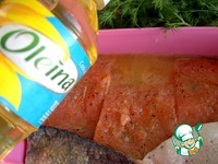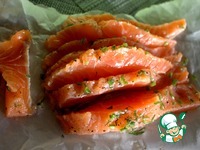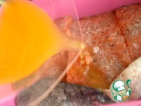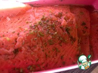 Форель, если надо, очистить. У меня готовое филе на коже, половинка от рыбы. Автором рекомендовано именно на коже, так удобнее потом срезать на порции. |