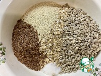 Смешать сухие ингредиенты в миске: овсяные хлопья, кунжут, семена льна и подсолнечника, соль, сахар. |