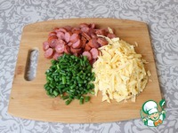 Пока жарится картофель нарезаю колбаски кружочками. Измельчаю стрелки чеснока. Натираю сыр на крупной тёрке. |