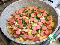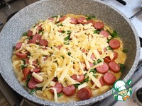 Выкладываю в сковороду на картофель половину сыра. Сверху распределяю чесночные стрелки и кружочки колбасок. |