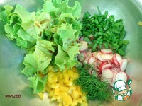 Описание: В салате простое сочетание овощей и зелени с энергией цвета и витаминов. Заправлен оливковым маслом и соевым соусом. Полезное решение для быстрой трапезы.