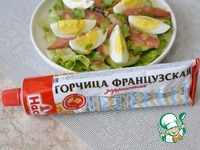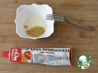 Делаем заправку. Смешиваем оливковое масло, сок лимона, соль, сахар и горчицу с зёрнами. У меня горчица "Французская", ТМ HAAS. Взбиваем заправку вилкой в однородную суспензию. |