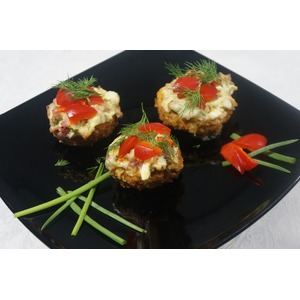 Описание: Шляпки шампиньонов запеченные в хрустящей панировке с зеленым луком, беконом и с горячим сыром. Украшение любого праздничного стола!