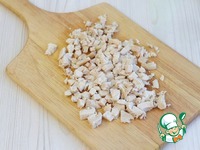 Филе куриной грудки (200 гр.) отварить в подсоленной воде, затем нарезать кубиками. |