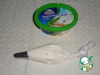Оставшийся творожный сыр с зеленью ТМ "Hochland" выкладываем в кондитерский мешок с насадкой. На каждый кусочек рулета отсаживаем "звездочки " творожного сыра. |