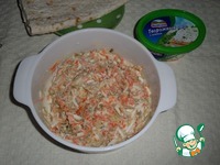 В чашку к натертым ингредиентам добавляем творожный сыр ТМ "Hochland" (примерно 2/3 баночки ). Солим по вкусу. |