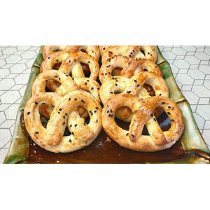 Выложить получившиеся крендельки на противень. Сверху смазать их взбитым яйцом и посыпать кунжутом.