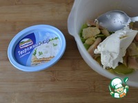 Кладём лосось и авокадо в чашу, добавляем творожный сыр. У меня - сливочный, Hochland. |