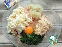 Далее добавить плавленный сырок, натёртый на крупной тёрке, порезанный укроп, яйцо, соль и молотый перец. |
