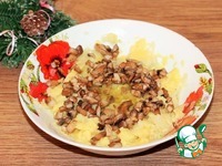 9. Затем обжариваем грибы, минуты 3. Добавляем к картофелю грибы, лук с чесноком, 1 ст. ложку яичного белка, молотую приправу (кориандр, зира, перец, паприка) и соль. |