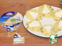 10. Делим начинку на 6 частей и мокрыми руками формируем колобки. Затем колобки немного приплющиваем и кладем порционные плавленные сырки. |