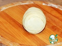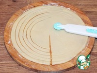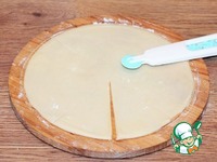 14. На припыленной разделочной доске, раскатываем поочередно колобки в круг, Ф=19 см. Затем немного подпыляем верх круга и делаем надрез до середины. |