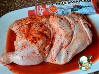 Курицу натереть смесью и посолить, залить пивом. Убрать в холодильник на 12-24 часа, периодически переворачивая. |
