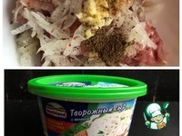 В фарш натереть лук на крупной терке, чеснок пропустить через пресс. Добавить соль, молотый перец, кориандр и творожный сыр. Тщательно вымесить фарш. |