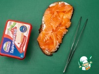 Слабосоленый лосось нарезать на тонкие ломтики, аккуратно свернуть и выложить на сыр. |