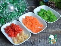 Нарезать мелким кубиком цукаты, их можно взять по своим предпочтениям. |