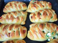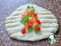 Колобок расплющить в круг, 12 - 14 см., слегка вытянуть верх. На середину выложить 1 ст. л. смеси цукатов. Сделать разрезы по бокам. |