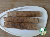 Сворачиваем блин в рулетик, кладём в холодильник, перед подачей рекомендую положить в морозилку на 15 минут, чтобы легче разрезать. |