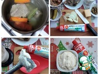 Чтобы сократить время приготовления салата, баранину и рис нужно сварить заранее. У меня баранина на рёбрышках. Отварила её в бульоне с добавлением лука, моркови, перца душистого, посолила и положила в конце приготовления лавровый лист. Рис в салате использую белый. Мне понадобится для салата 1 стакан ёмкостью 200 мл отварного риса. Сделаю домашний майонез на сливках 10% без яиц. В кружку погружного блендера налью сливок, добавлю сахар, соль, горчицу, лимонный сок и соединю. Не прекращая работать блендером, тонкой струйкой буду наливать подсолнечное масло. Масса моментально будет густой. Попробовала на соль и сахар - меня устроил вкус. Теперь добавлю в майонез хрен со сливками HAAS, опять блендером соединю. Мне по вкусу было достаточно 1 ч л (хрен в ней был взят с горкой). Количества полученного майонеза у меня почти всё уйдёт для приготовления салата. Останется пара чайных ложек. Майонез можно и не делать, а купить готовый и добавить в него хрен. |
