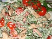 А теперь собственно соус:2 ст. л майонеза,2 ст. уксуса,1 ст. л горчицы 0.5 ч. л сахара и зубчик чеснока выдавленный через чеснокодавку, смешиваем-готово. Заливаем салат. |