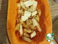 В тыкву укладываем слой яблок, кусочки масла, посыпаем корицей. При желании можно в тот слой тоже добавить творожного сыра. |