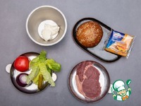 Затем тонко нарезанный стейк, сыр плавленый «Чизбургер», листья салата романо, накрыть верхушкой булки, предварительно смазанной майонезом. |