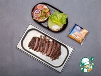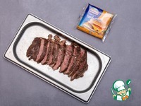 Стейк из мраморной говядины посолить, поперчить и обжарить на сковороде (желательно гриль) с двух сторон по 2,5 минуты до рекомендуемой прожарки медиум, тонко нарезать наискосок. |