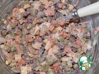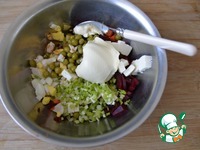 Соединяем все ингредиенты. кладём мелко порезанный зелёный лук, зелёный горошек. Соль, смесь перцев молотую. |
