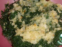 Лук измельчите и обжарьте до золотистого цвета,добавьте к зелени |