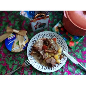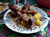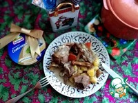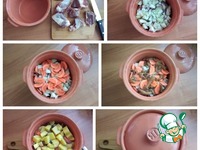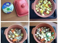 Для жаркого я возьму горшок ёмкостью-1 л. Нужно сварить опята в подсоленной воде минут 10-15. Нам понадобится бульон. Нога баранья у меня нарубленная и я возьму для жаркого мясные кусочки. Они будут на косточках. На низ горшка выкладываем баранину. На неё - лук репчатый, порезанный произвольно, на него - морковь порезанную, далее - выловленные шумовкой опята и на самый верх укладываем картофель, тоже порезанный произвольно, но его не мельчите. Заливаем до середины горшка бульоном из-под опят. Он подсоленный. Накрываем крышкой и ставим в духовку на 1 час, выставив т-200 С. Минут через 15, когда в горшке закипит, убавляем температуру до 130 С. Томим содержимое горшка. |