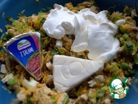 Связующим ингредиентом будет сметана и плавленные сырки с салями от Хохланд. Смешать тщательно. |