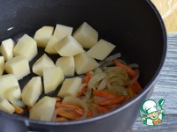 На масле обжарить лук, затем морковь, добавить кусочки картофеля, жарить 5 минут, огонь средний. |