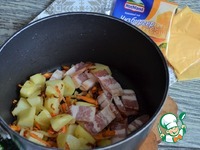 Добавить резанный бекон, жарить 5 минут, огонь средний. |