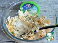 Лаваш покрошить, добавить рубленную зелень, яйца и белок, творожный сыр. Аккуратно перемешать. |