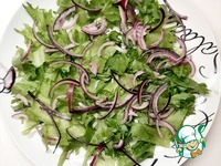 Листья салата нарезать, выложить на блюдо. Сверху нарезанный лук. |