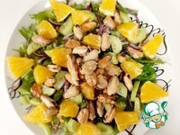 Затем нарезанные огурец, апельсин. Сверху мидии. Полить немного соком апельсина. |
